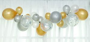 セット内容:バルーン大:ゴールドスターコンフェッティ入りx4/ゴールドx4/シルバーx4 バルーン小:ゴールドx6/シルバーx6/ホワイトx6 (上記の内,各1個はスペア)バルーンテープx1本(2.5m)